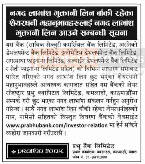 Prabhu Bank Limited has published a notice to collect due dividends.
