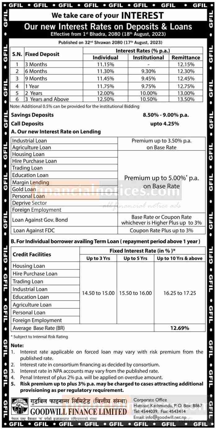 गुडविल फाइनान्सको नयाँ ब्याजदर परिवर्तन सम्बन्धी सूचना