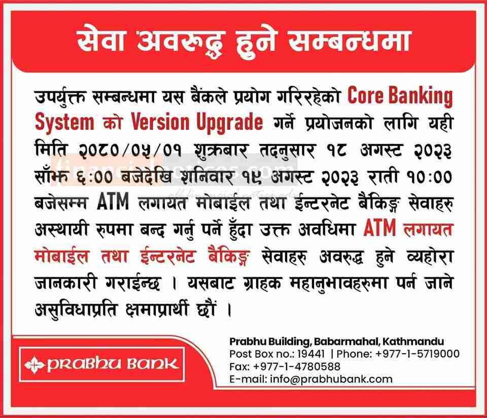 प्रभु बैंकको सेवा अवरुद्ध हुने सम्बन्धमा अत्यन्त जरूरी सूचना