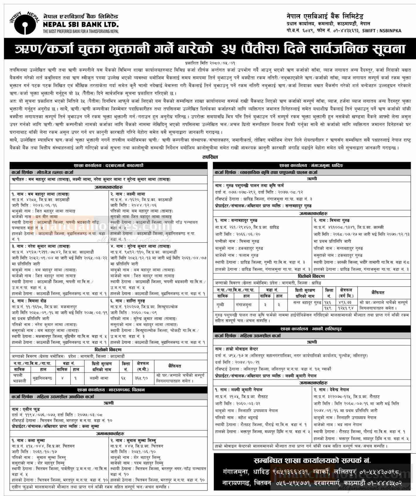 नेपाल एसबिआई बैंकको ऋण कर्जा चुक्ता भुक्तान गर्ने बारेको ३५ दिने सूचना