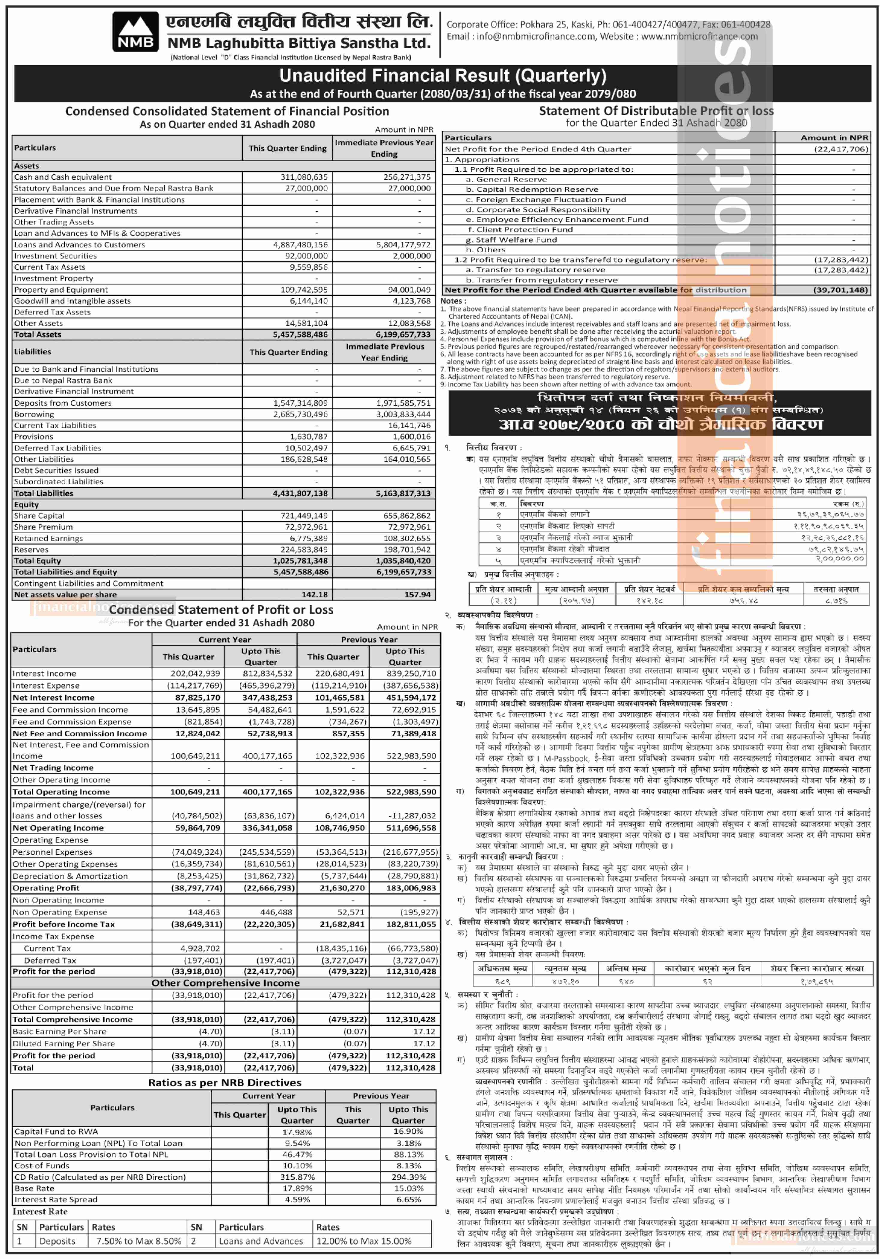 एनएमबी लघुवित्तको खाराब कर्जा ९.५४ प्रतिशत, नाफा २ करोड २४ लाख रुपैयाँ ऋणात्मकमा - Q4 Report -