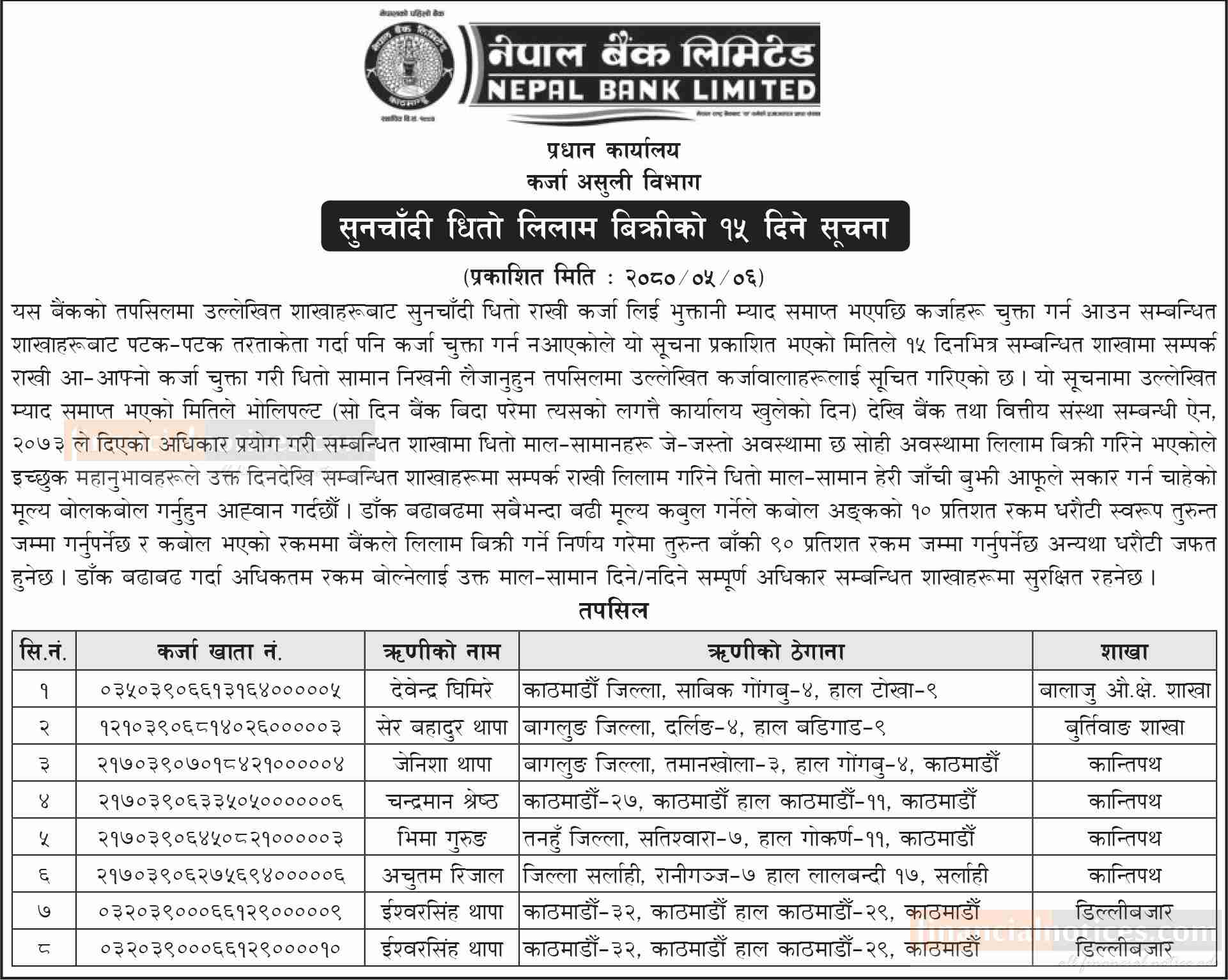 नेपाल बैंकको सुनचाँदी धितो लिलाम बिक्रीको १५ दिने सूचना
