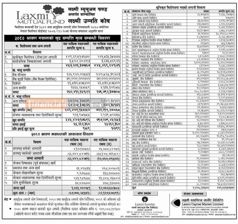 Laxmi Capital has disclosed the Net Asset Value of the "Laxmi Unnati Kosh" up to Shrawan 2080.
