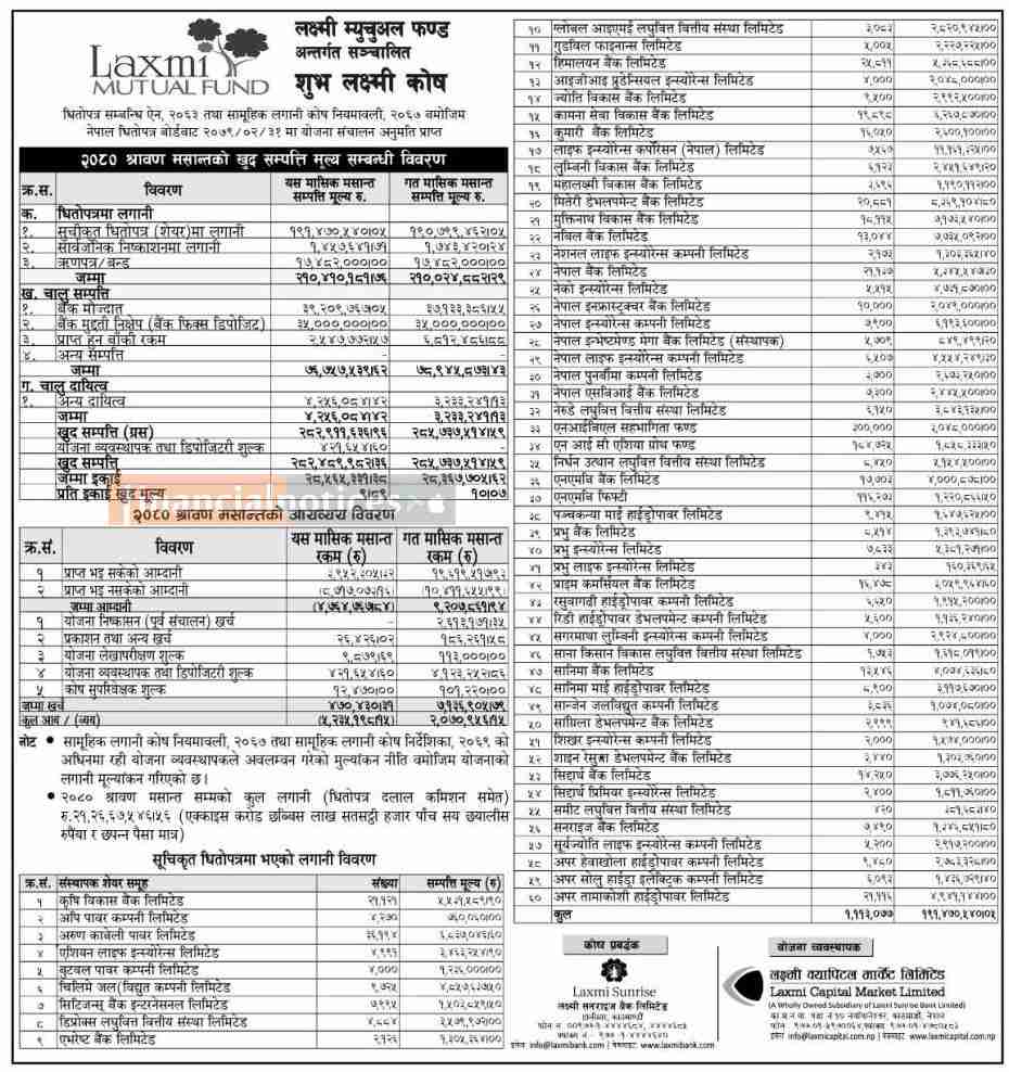 Laxmi Capital has released the Net Asset Value of the "Shubha Laxmi Kosh" up to Shrawan 2080