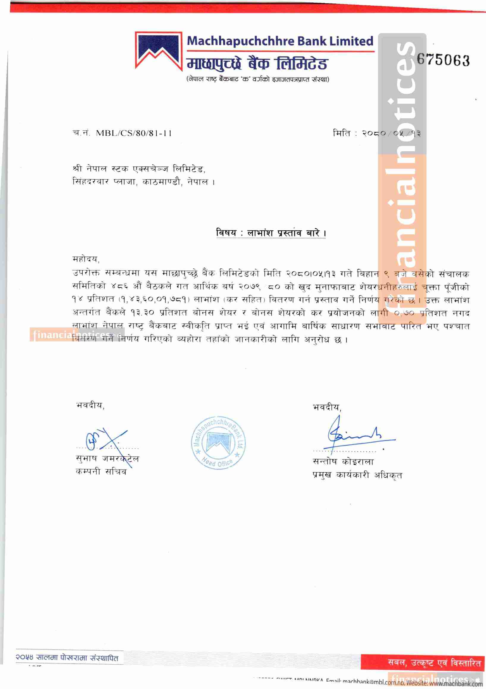 माछापुच्छ्रे बैंकको लाभांश प्रस्ताव सम्बन्धी सूचना - MBL Bonus -