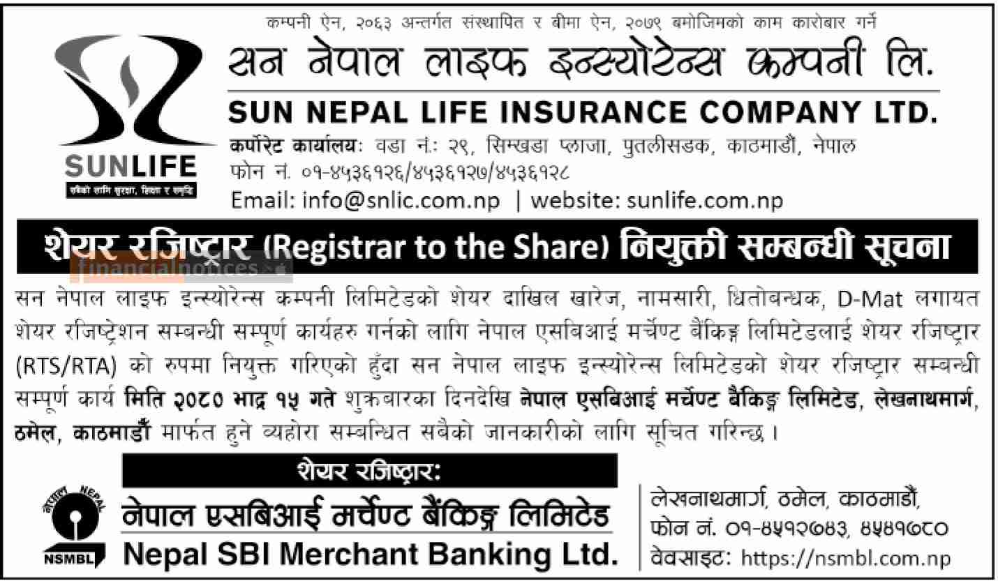 शेयर रजिष्ट्रार नियुक्ति सम्बन्धी सूचना