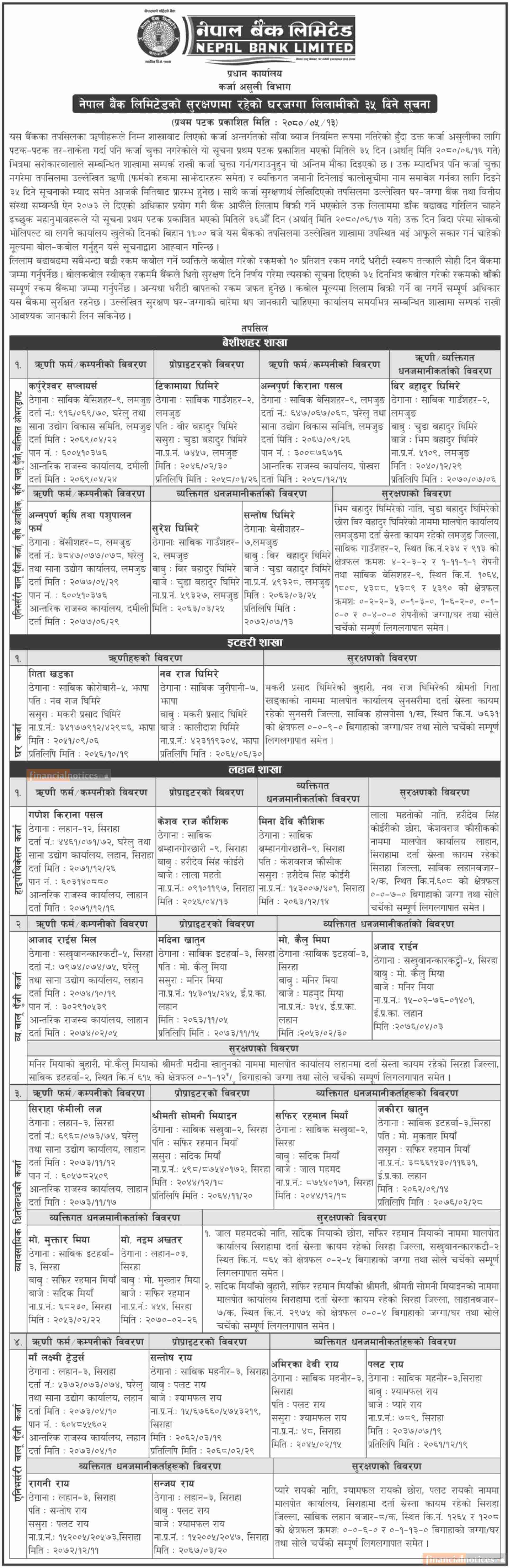 नेपाल बैंकको सुरक्षणमा रहेको घरजग्गा लिलामीको ३५ दिने सूचना