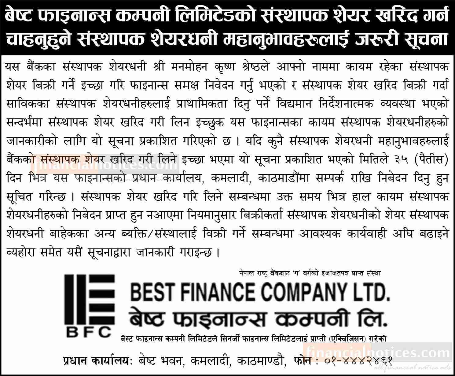 संस्थापक शेयर खरिद गर्न चाहानुहुने संस्थापक शेयरधनीहरुलाई ३५ दिने जरुरी सूचना