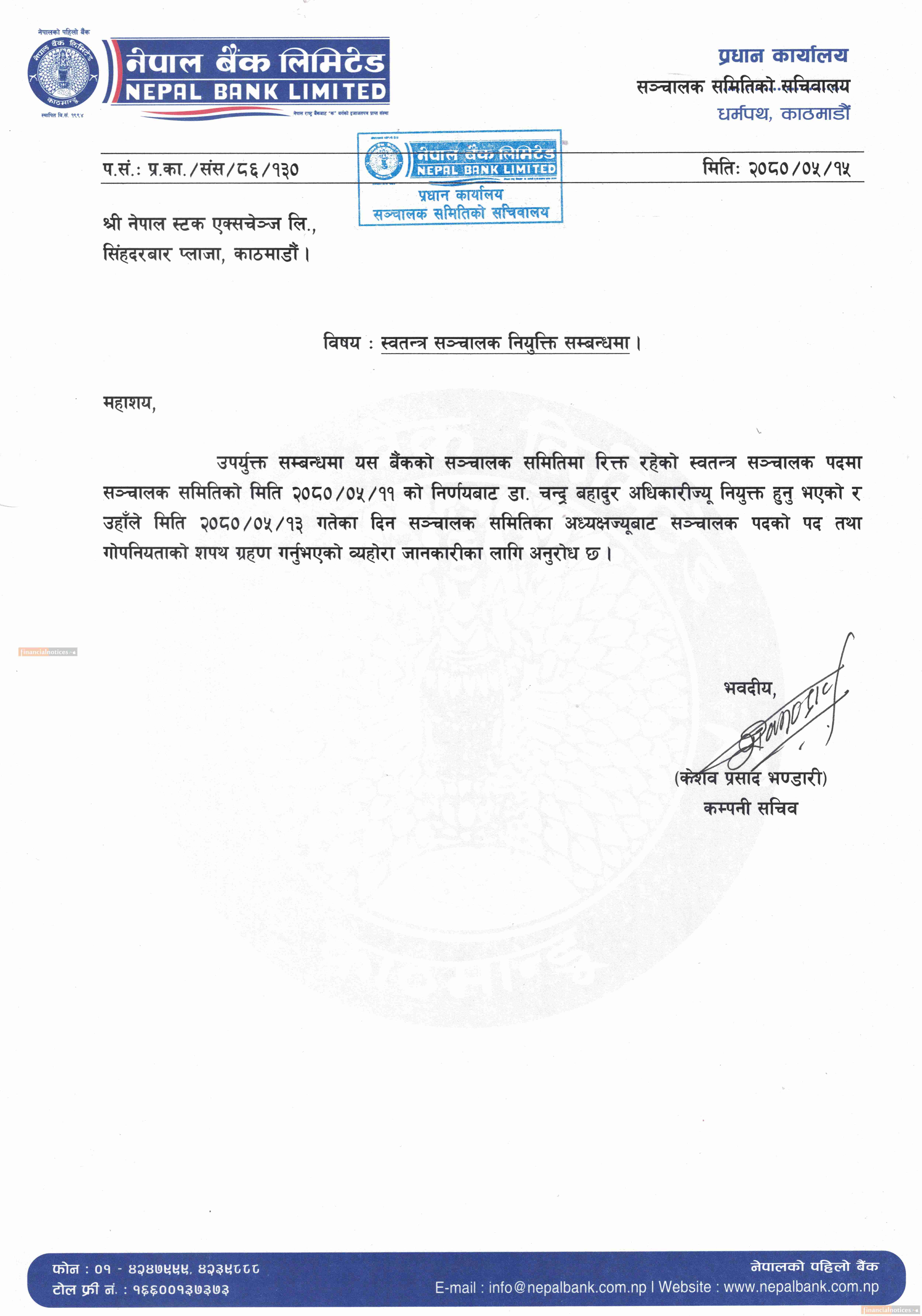 नेपाल बैंकको स्वतन्त्र संचालकको नियुक्ति सम्बन्धी सूचना