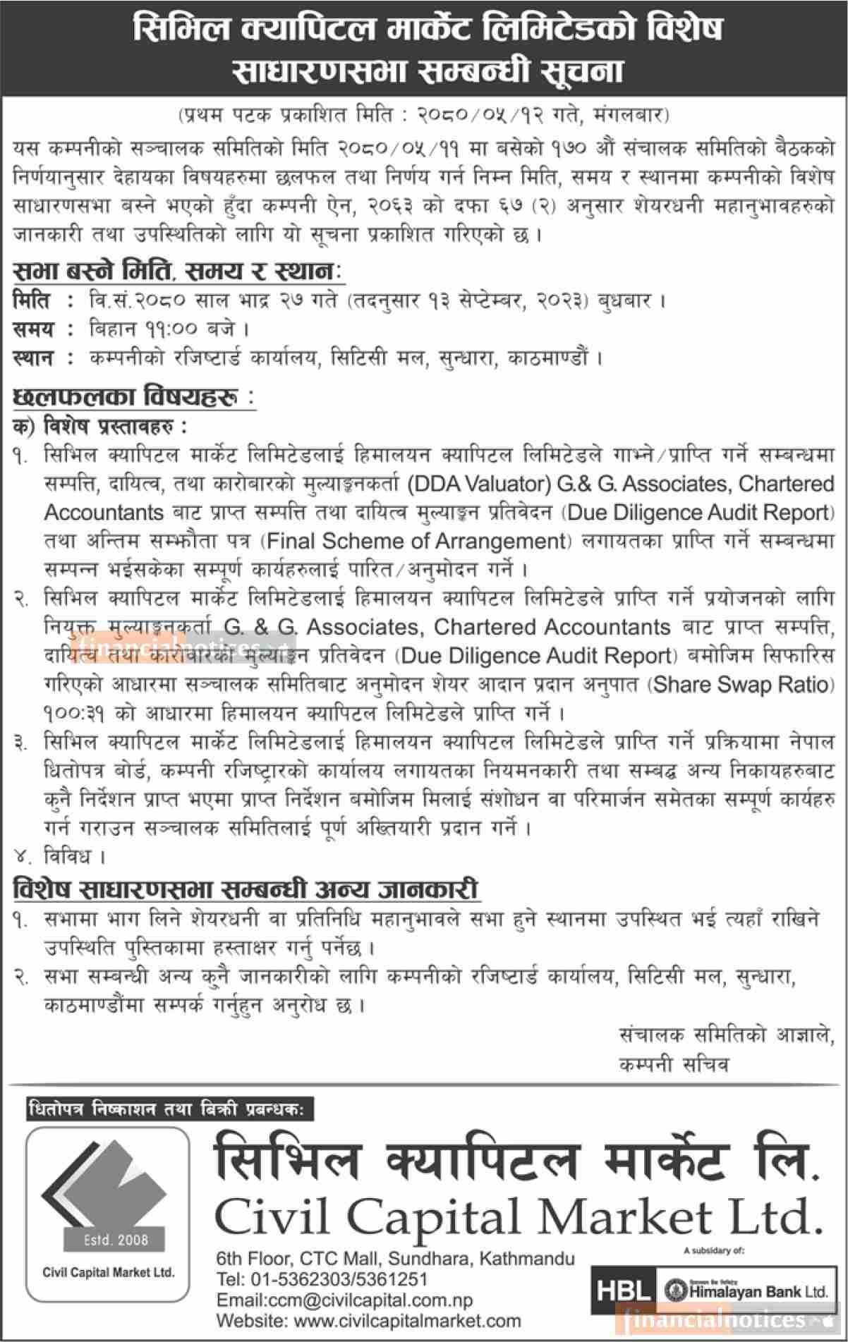 सिभिल क्यापिटल मार्केटको विशेष साधारणसभा सम्बन्धी सूचना