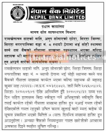 सात दिनभित्र हाजिरहुन आउने सम्बन्धमा नेपाल बैंकको जरुरी सूचना