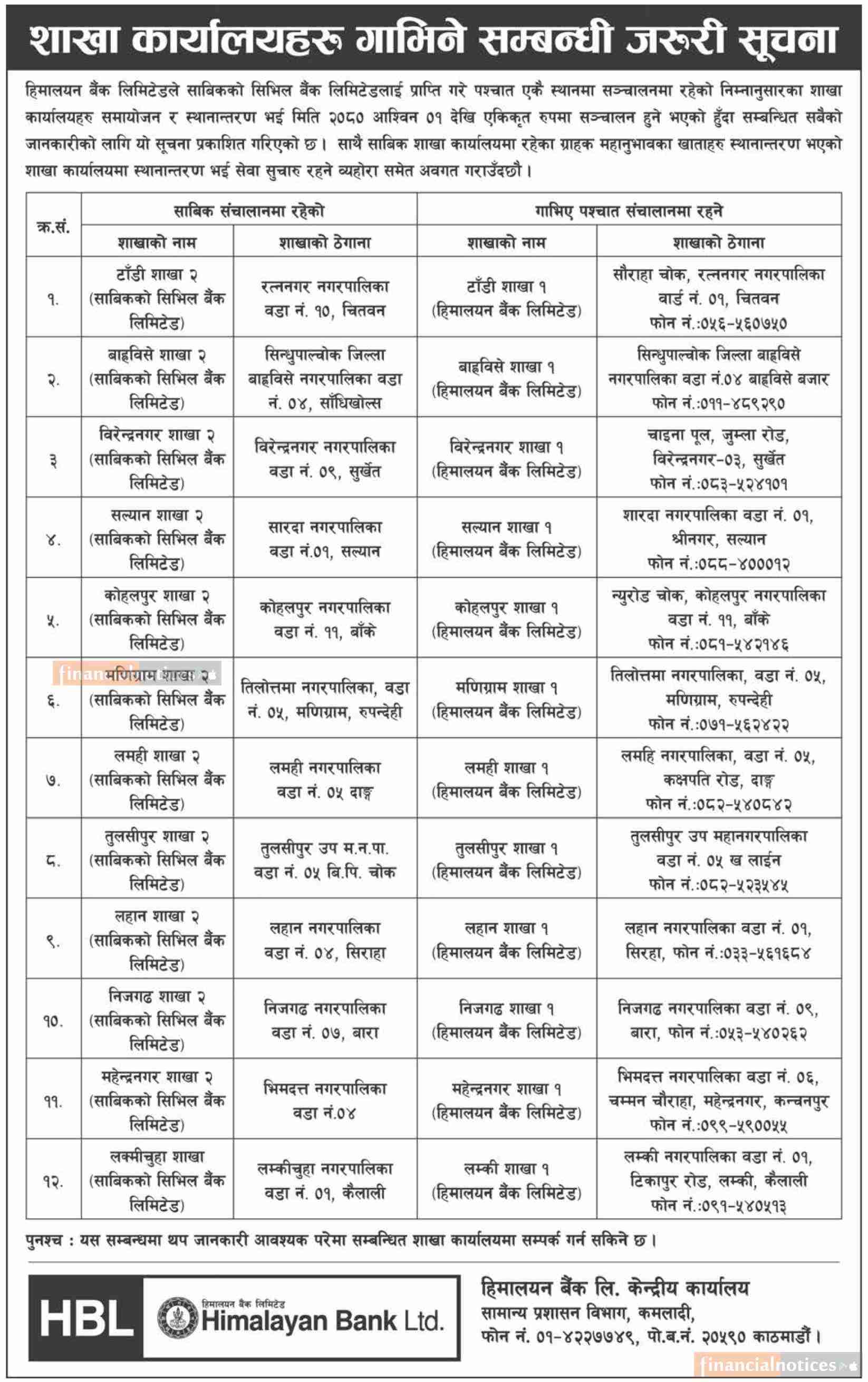 हिमालयन बैंकको शाखा कार्यालयहरु गाभिने सम्बन्धी सूचना