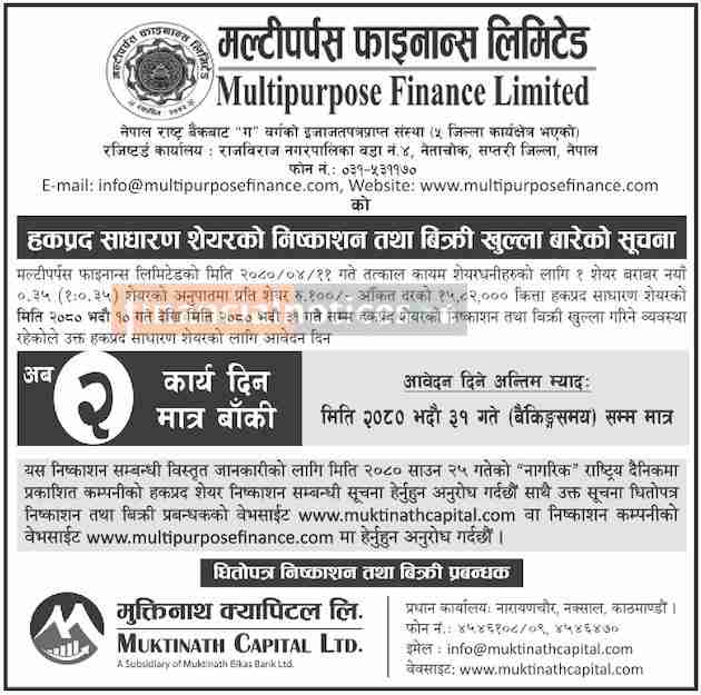 हकप्रद शेयरको निष्काशन तथा बिक्री खुल्ला सम्बन्धी सूचना - २ दिन बाँकी