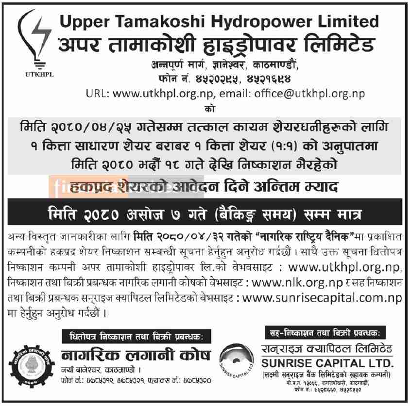 अपर तामाकोशी हाइड्रोको हकप्रद शेयरको आवेदन दिने अन्तिम म्याद थाप बारे सूचना