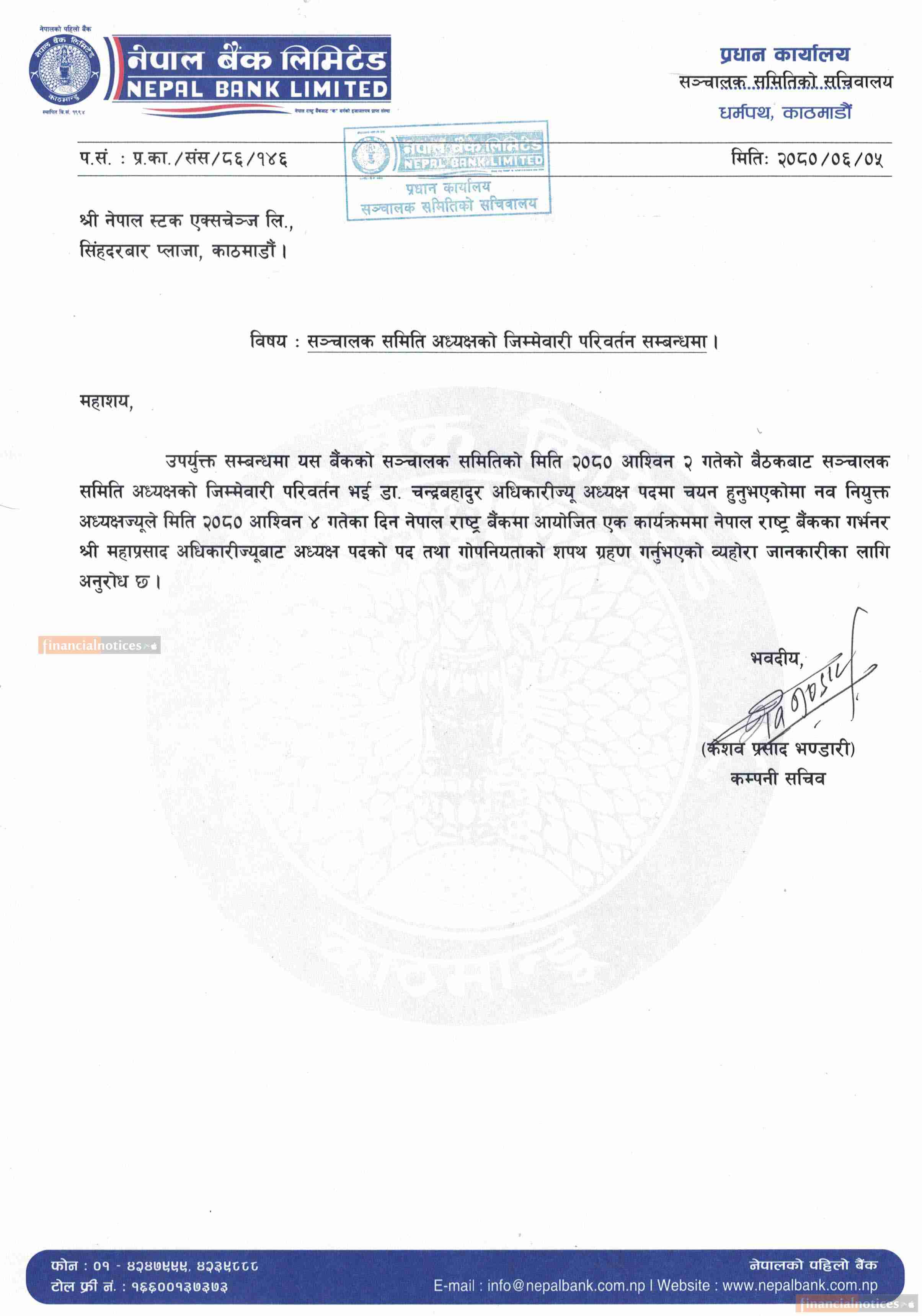 Notice About newly appointed Chairperson of Nepal Bank