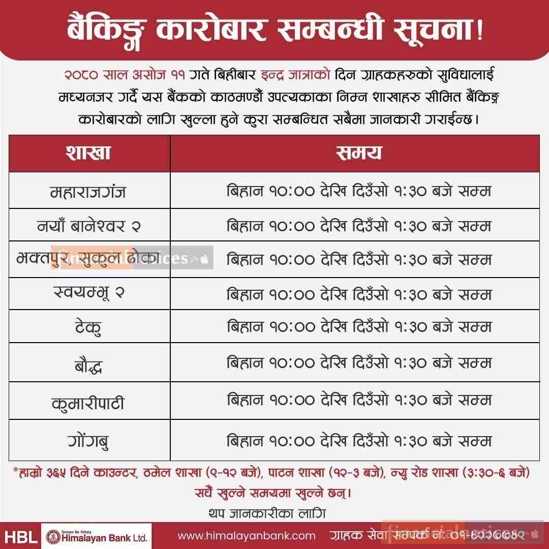 ईन्दजात्राको दिन हिमालयन बैंकको कुन शाखा कति बजेसम्म खुल्ला रहन्छन् ?