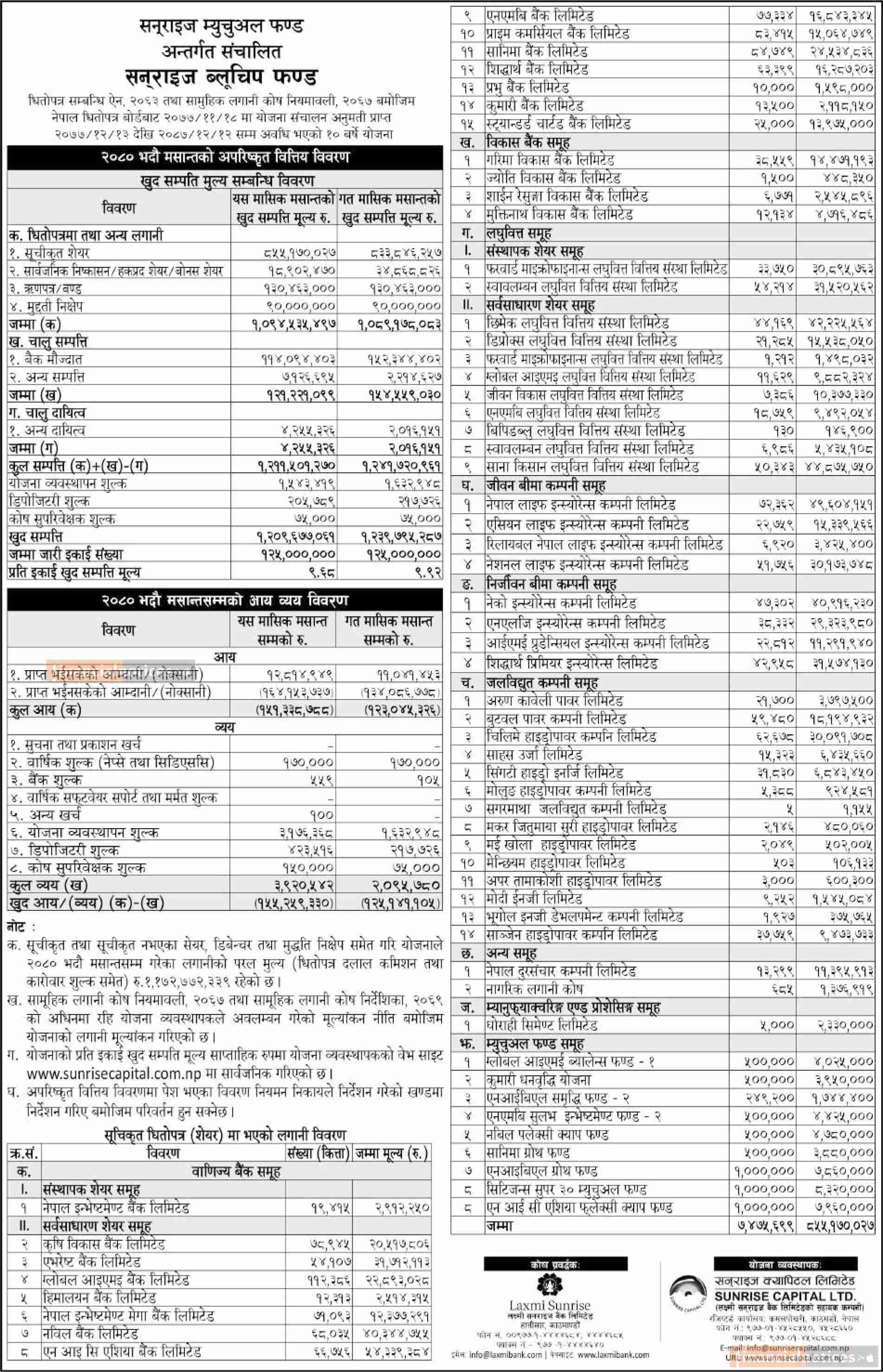 Sunrise Capital has released the Net Asset Value of Sunrise Bluechip Fund up until Bhadra, 2080
