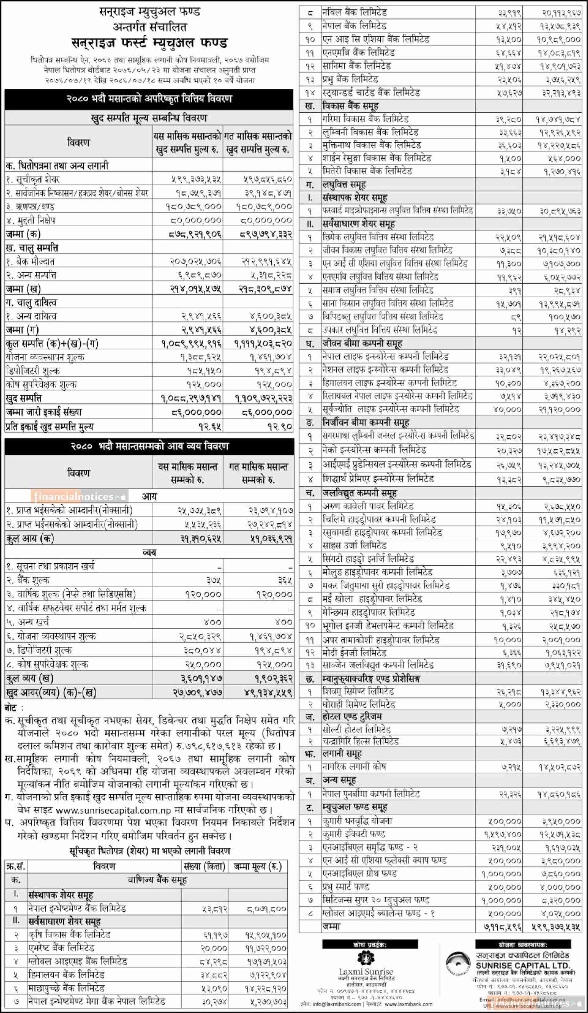 Sunrise Capital has released the Net Asset Value of Sunrise First Mutual Fund up until Bhadra, 2080