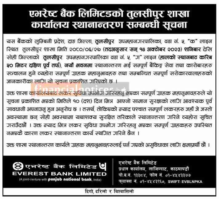 एभरेष्ट बैंकको शाखा कार्यालय स्थानान्तरण सम्बन्धी सूचना