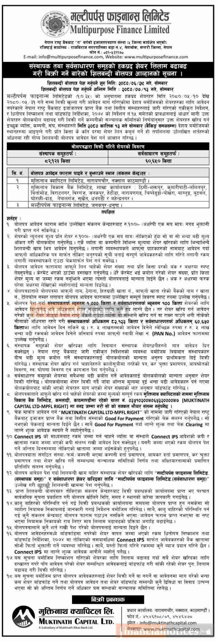 मल्टीपर्पस फाइनान्सको संस्थापकतर्फ ८२,१२३ र सर्वसाधारण तर्फ ६०,६५० कित्ता हकप्रद्य शेयर बिक्रीमा