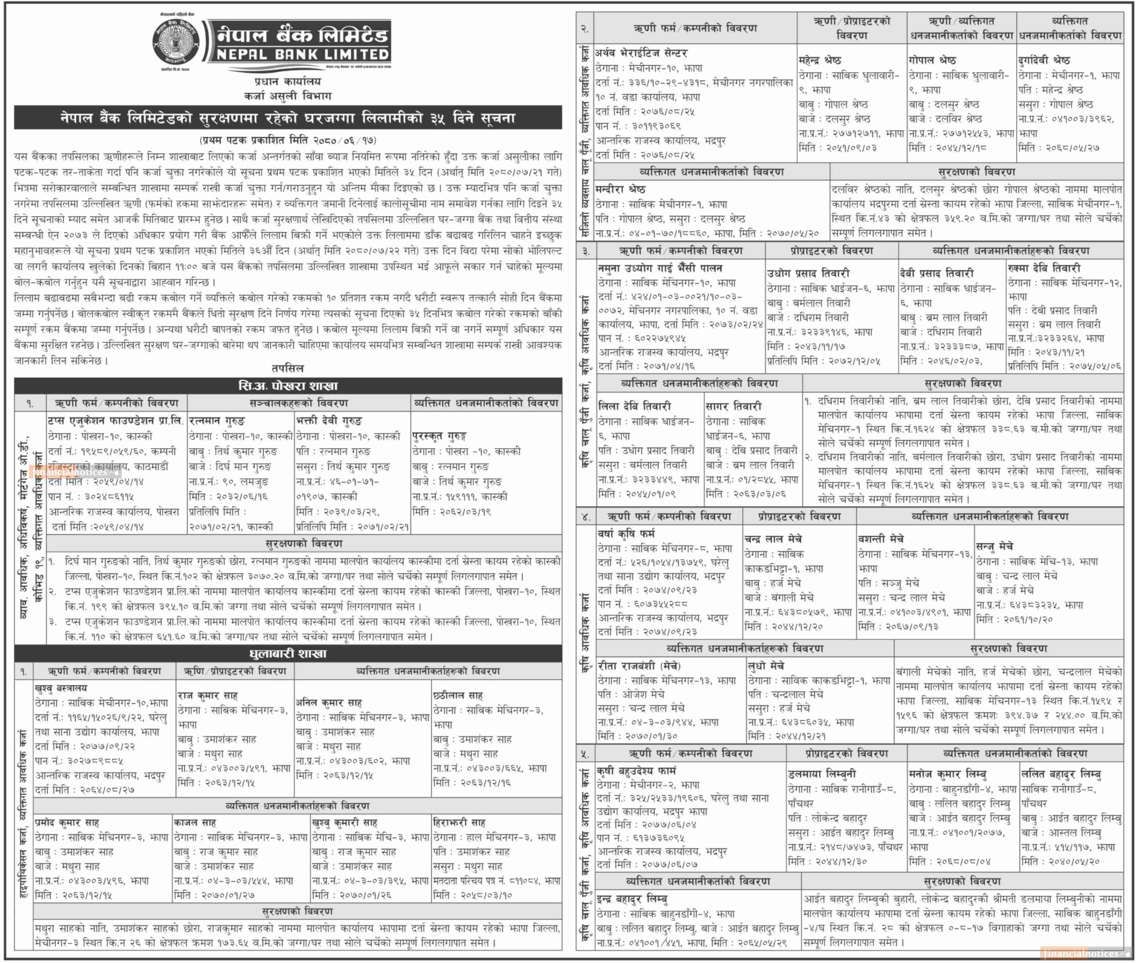 नेपाल बैंकको सुरक्षरणमा रहेको घरजग्गा लिलामीको ३५ दिने सूचना