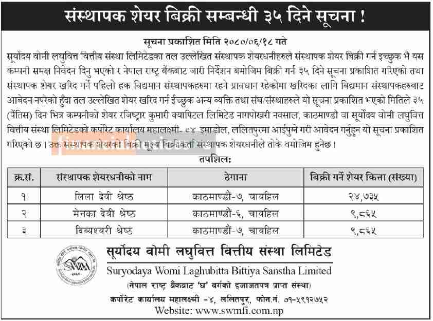 संस्थापक शेयर बिक्री सम्बन्धी ३५ दिने सूचना