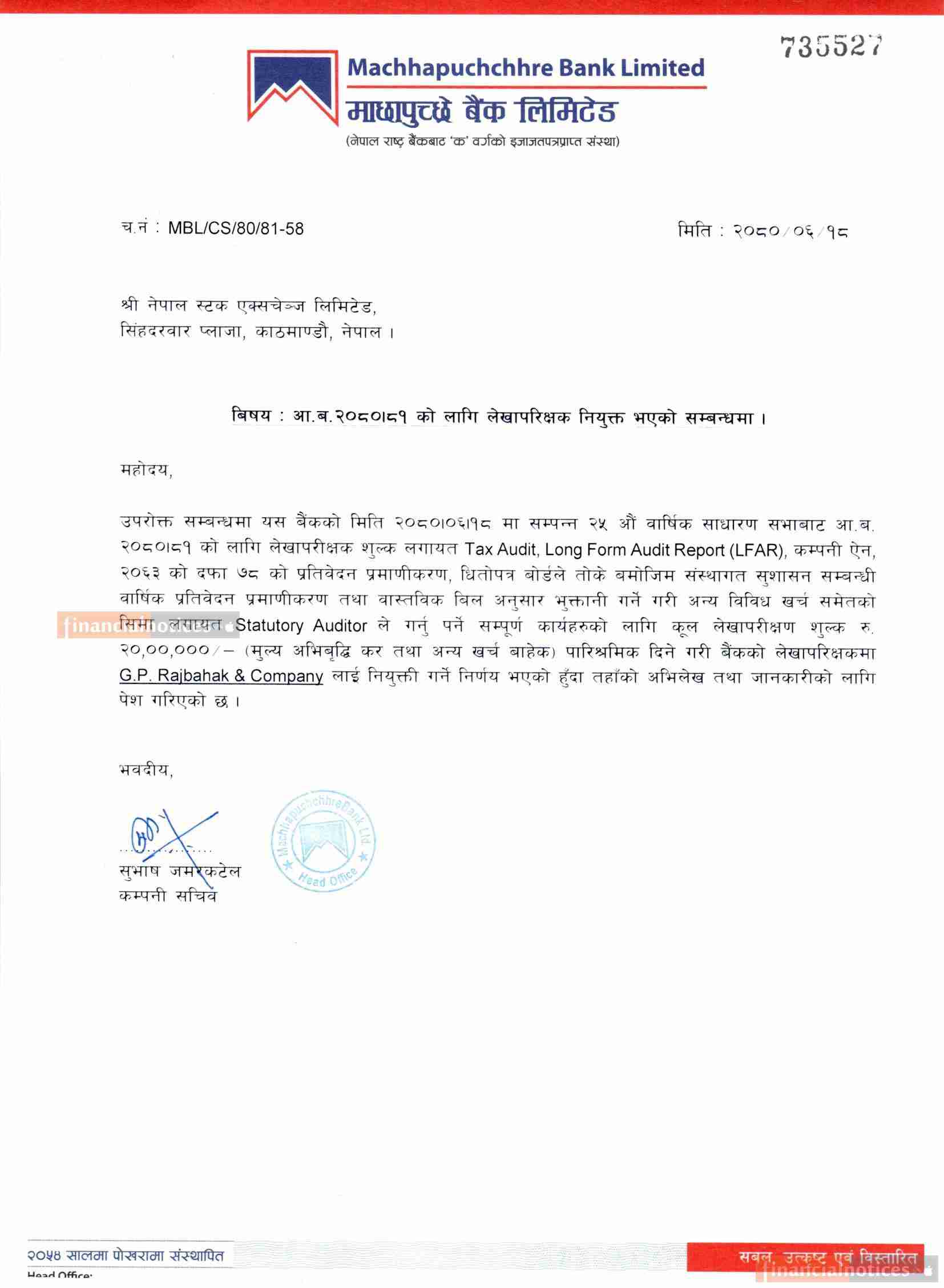 माछापुच्छ्रे बैंकको लेखा परिक्षक नियुक्ति भएको सम्बन्धी सूचना