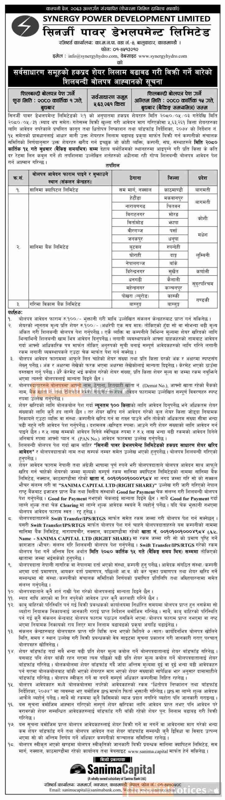 सिनर्जी पावरको हकप्रद शेयर लिलाम बढाबढ गरी बिक्री गर्नेबारे सूचना