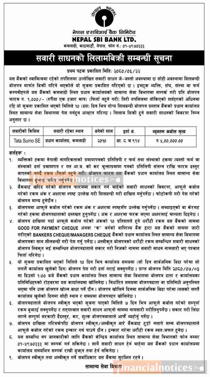 नेपाल एसविआई बैंकको सवारी साधनको लिलाम बिक्री सम्बन्धी सूचना