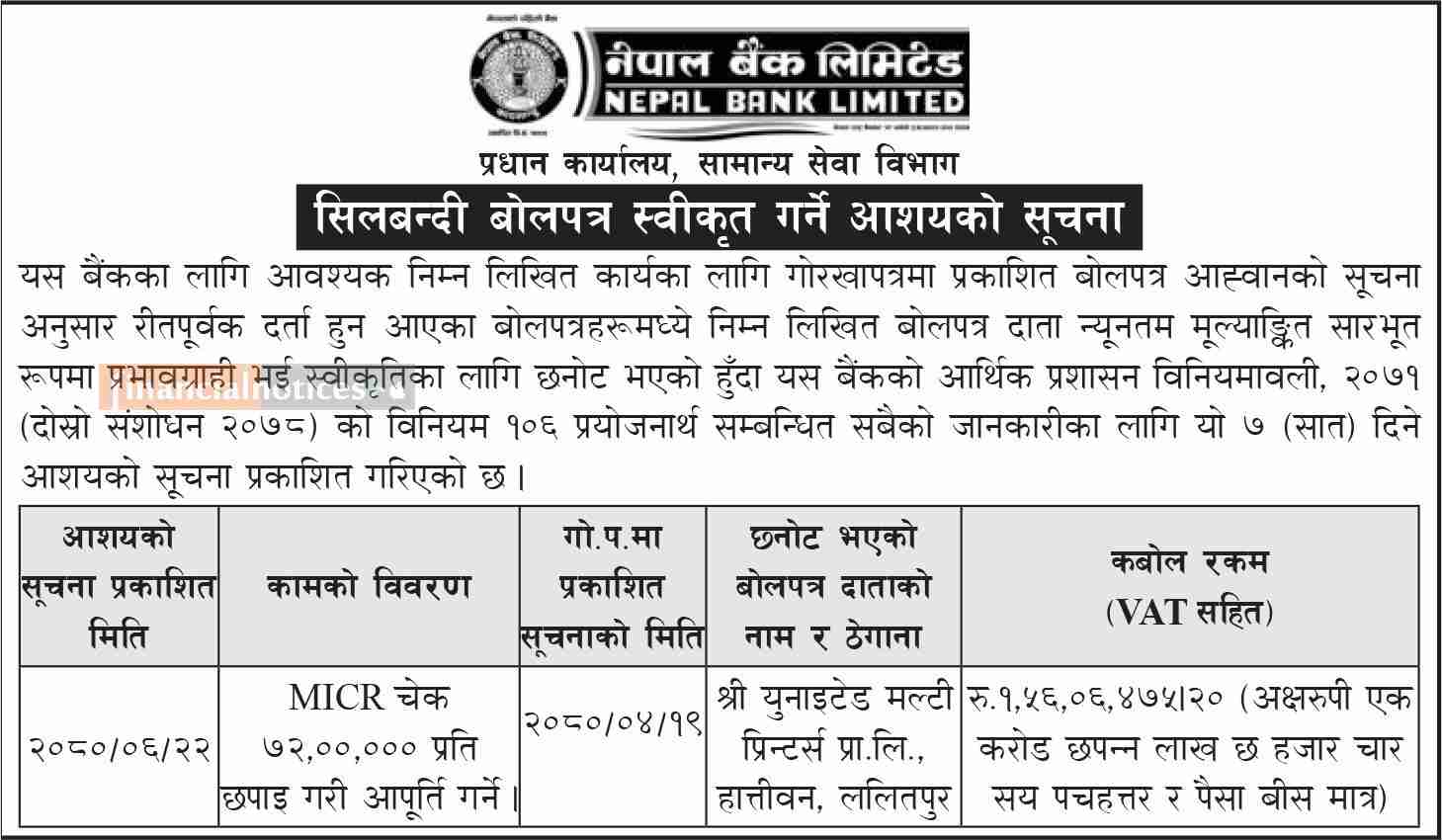 सिलबन्दी बोलपत्र स्वीकृत गर्ने आशयको नेपाल बैंकको सूचना