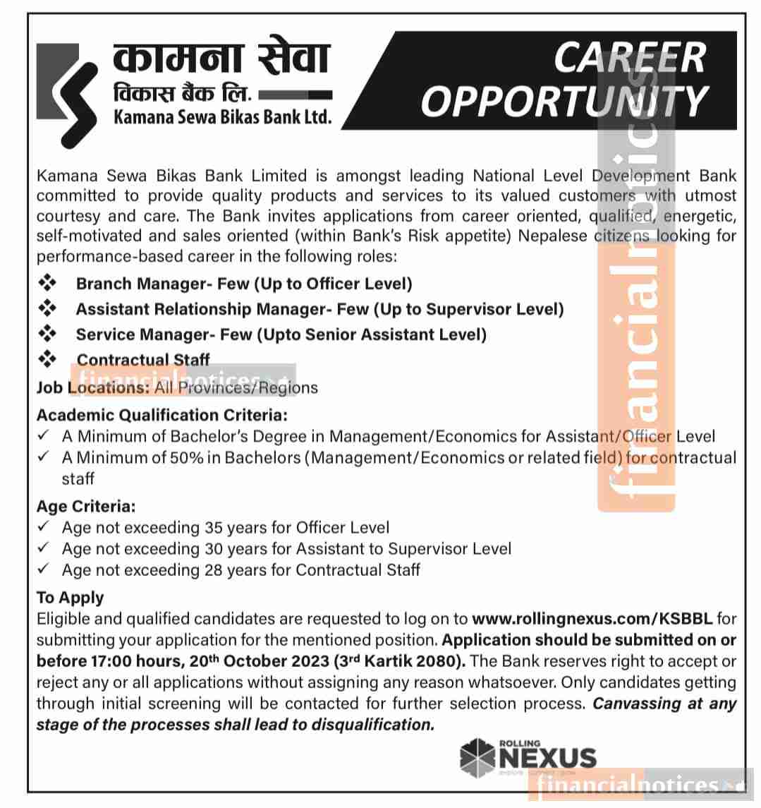 In a bid to enhance its commitment to excellence, Kamana Sewa Bikas Bank Limited announces job openings for qualified Nepalese citizens. The National Level Development Bank is on the lookout for energetic and self-motivated individuals with a sales-oriented approach. Positions include Branch Manager, Assistant Relationship Manager, Service Manager (up to Senior Assistant Level), and Contractual Staff.