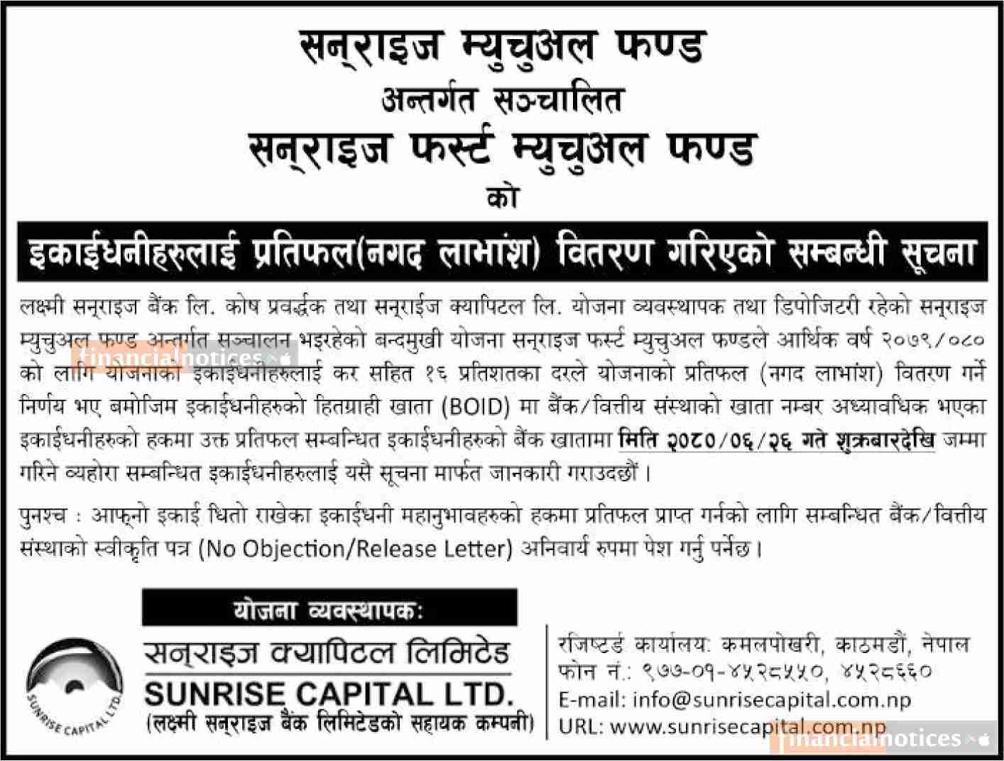 सन्राइज फस्र्ट म्युटुवल फण्डको नगद लाभांश वितरण सम्बन्धी सूचना