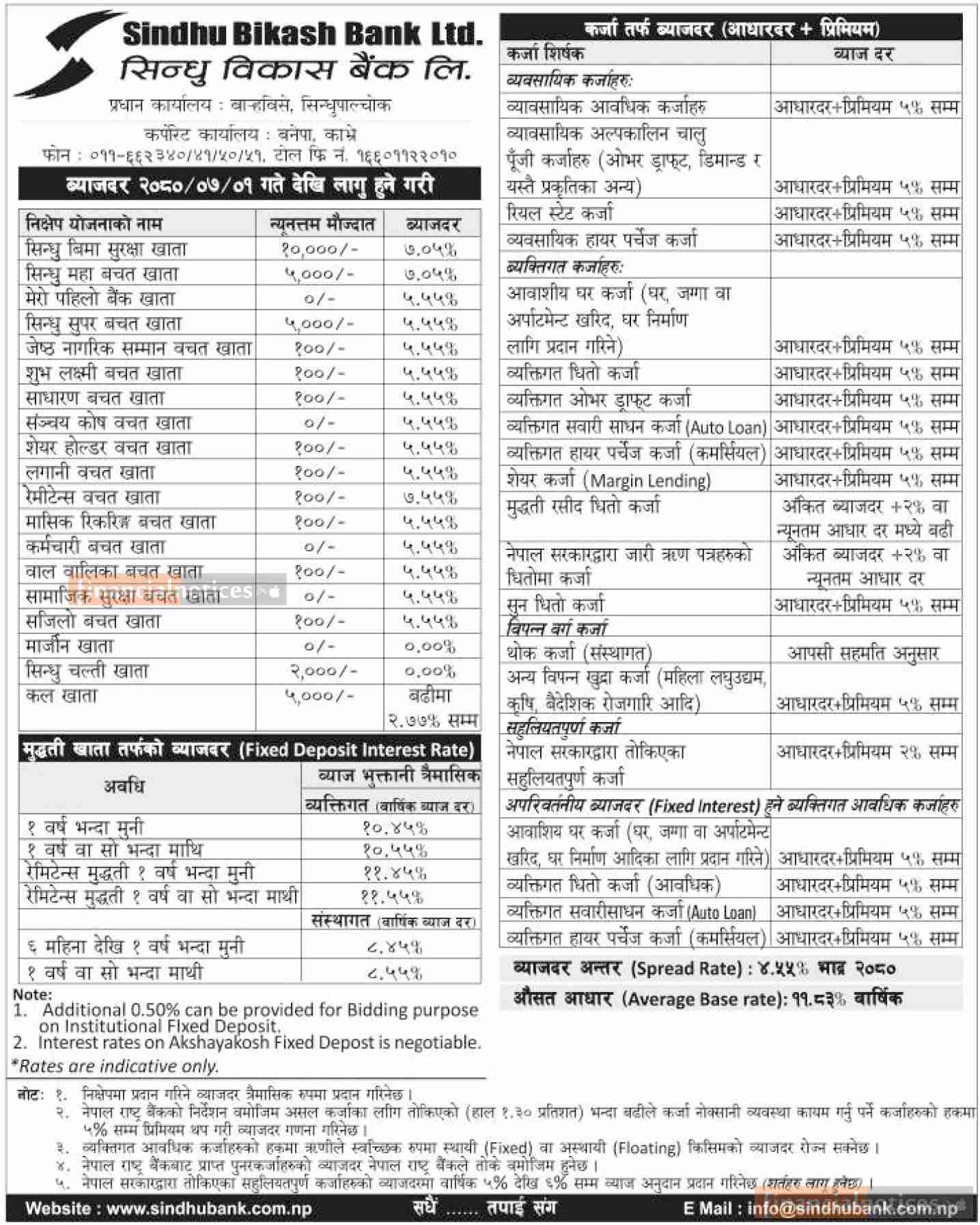 New Interest Rate Notice of Sindhu Bikas Bank