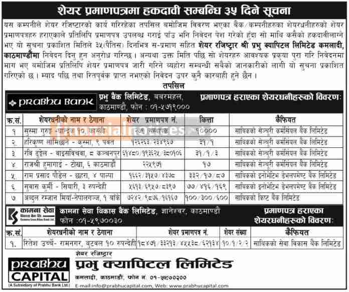 शेयर प्रमाणपत्रमा हकदावी सम्बन्धी सूचना