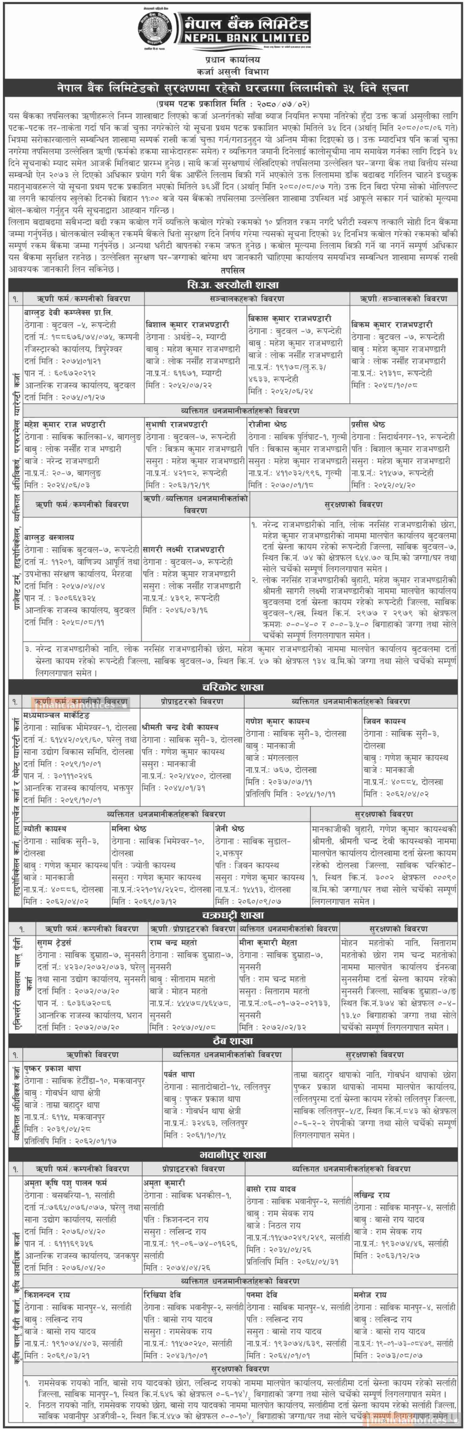 नेपाल बैंकको सुरक्षरणमा रहेको घरजग्गा लिलामीको ३५ दिने सूचना