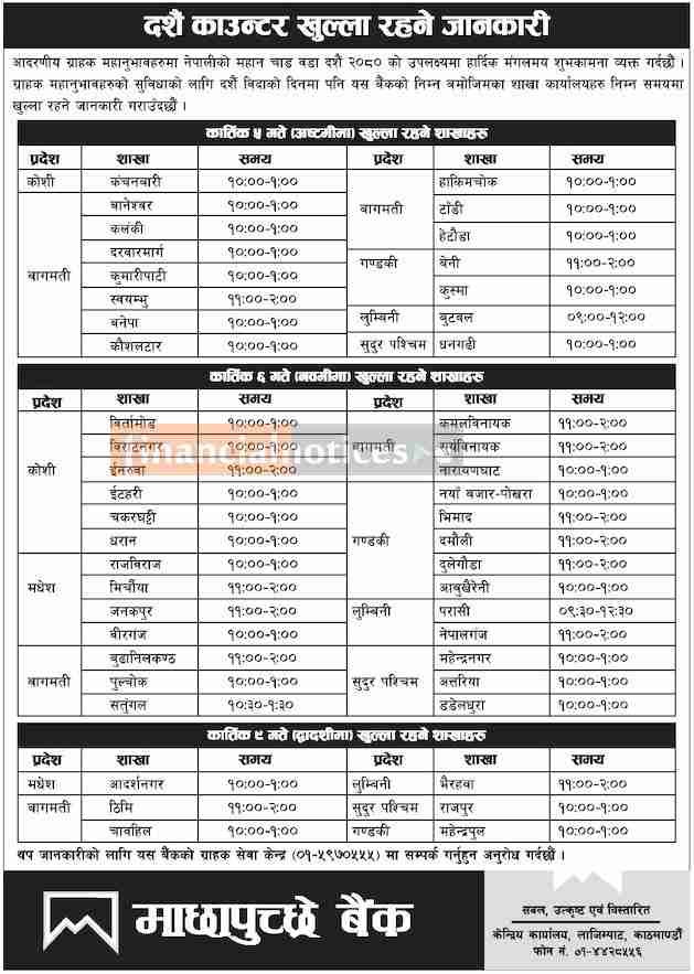 माछापुच्छ्रे बैंकको दशैं काउण्टर खुल्ला रहने सम्बन्धी जरुरी सूचना