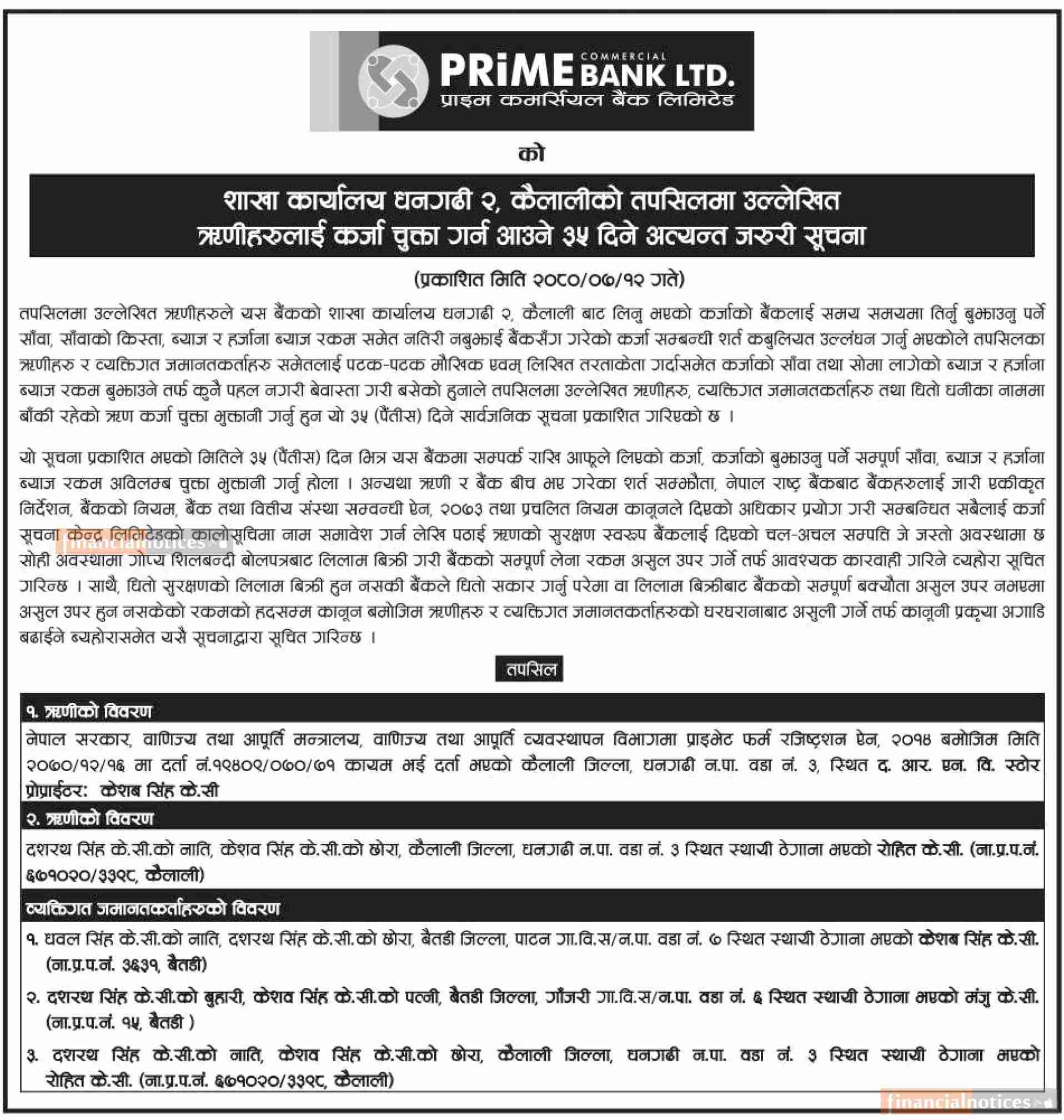 प्राइम बैंक धनगढी कैलाली शाखाका उल्लेखित ऋणीहरुलाई ऋणकर्जा चुक्ता गर्न आउने बारे सूचना