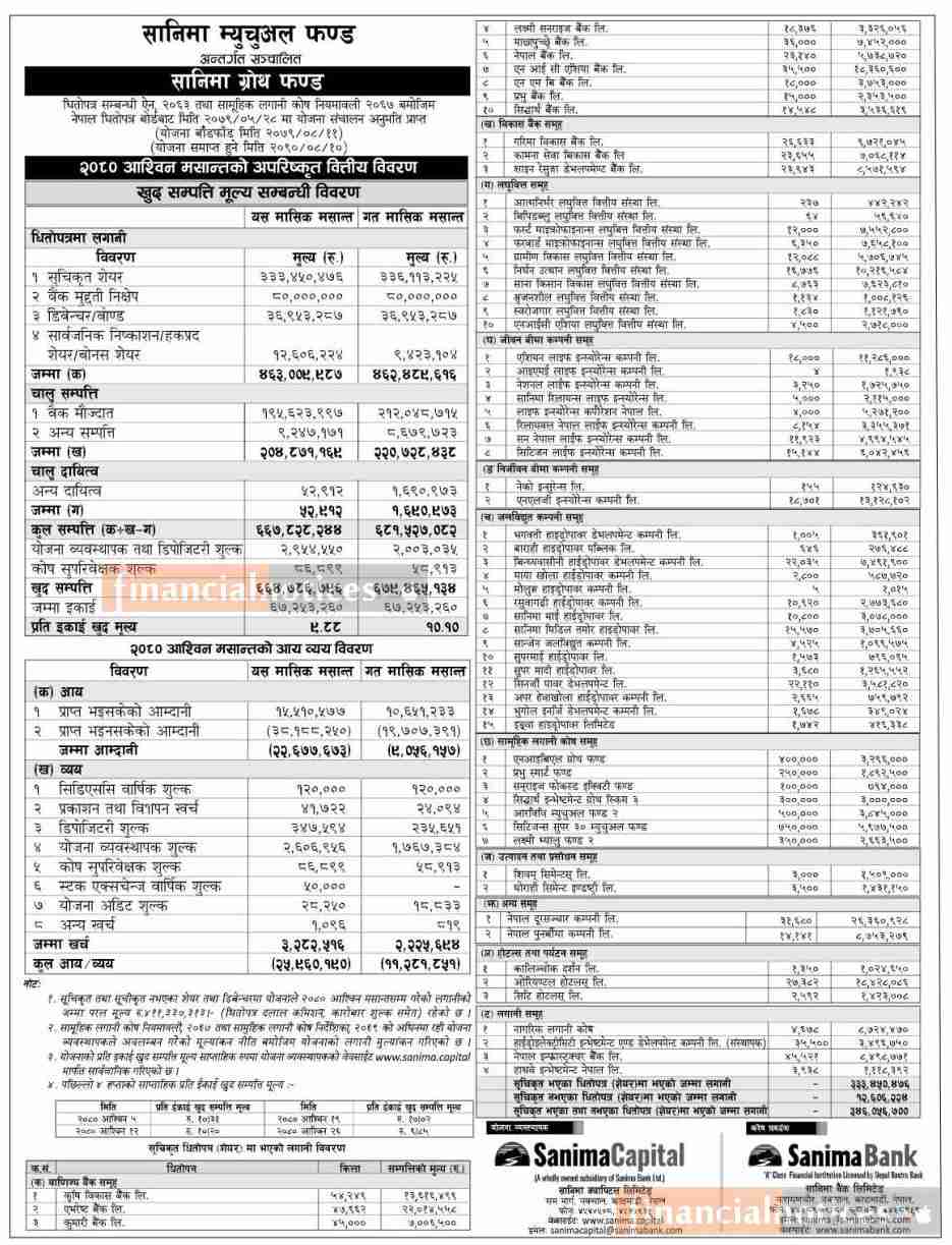 Sanima Capital Releases Net Asset Value or "Sanima Growth Fund" as of Ashwin 2080 -