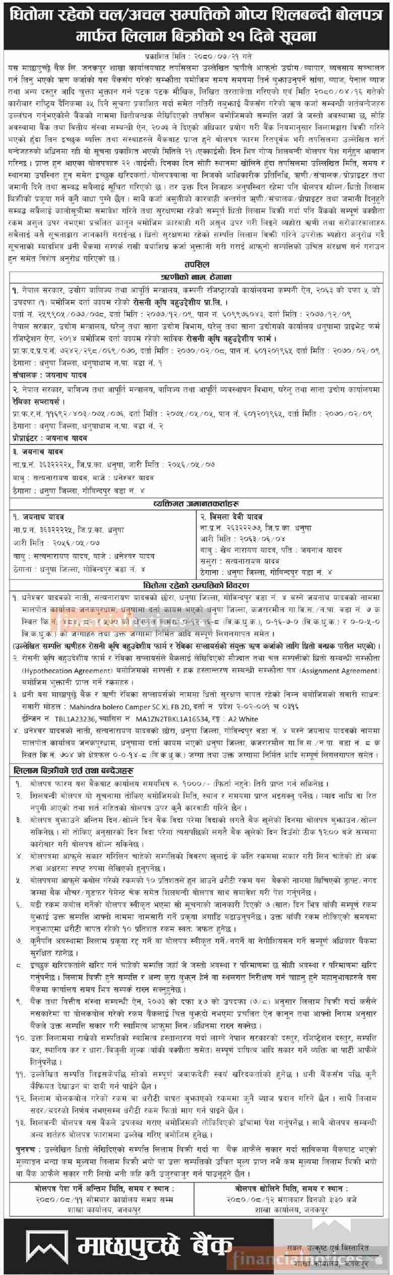 Kumari Bank Auction Notice for Non-Banking Assets at Mahendranagar, Kanchanpur -