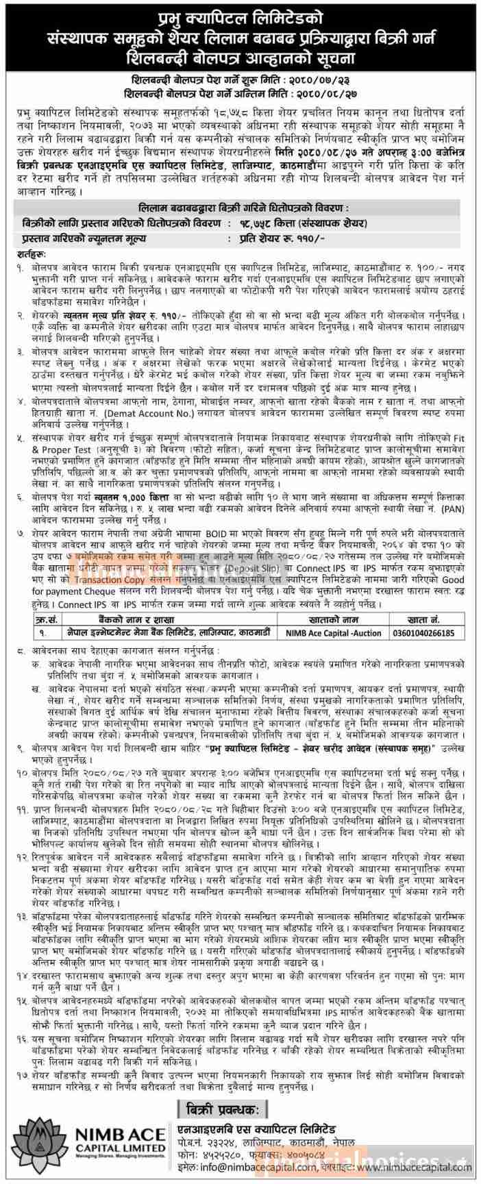 प्रभु क्यापिटलको १८७५८ कित्ता शेयर बिक्री सम्बन्धी सूचना