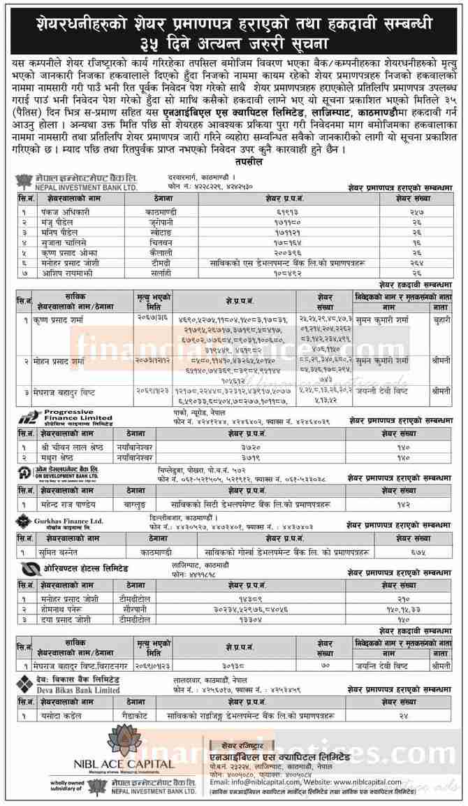 सेयर प्रमाण पत्रको लागि हकदवीको सूचना