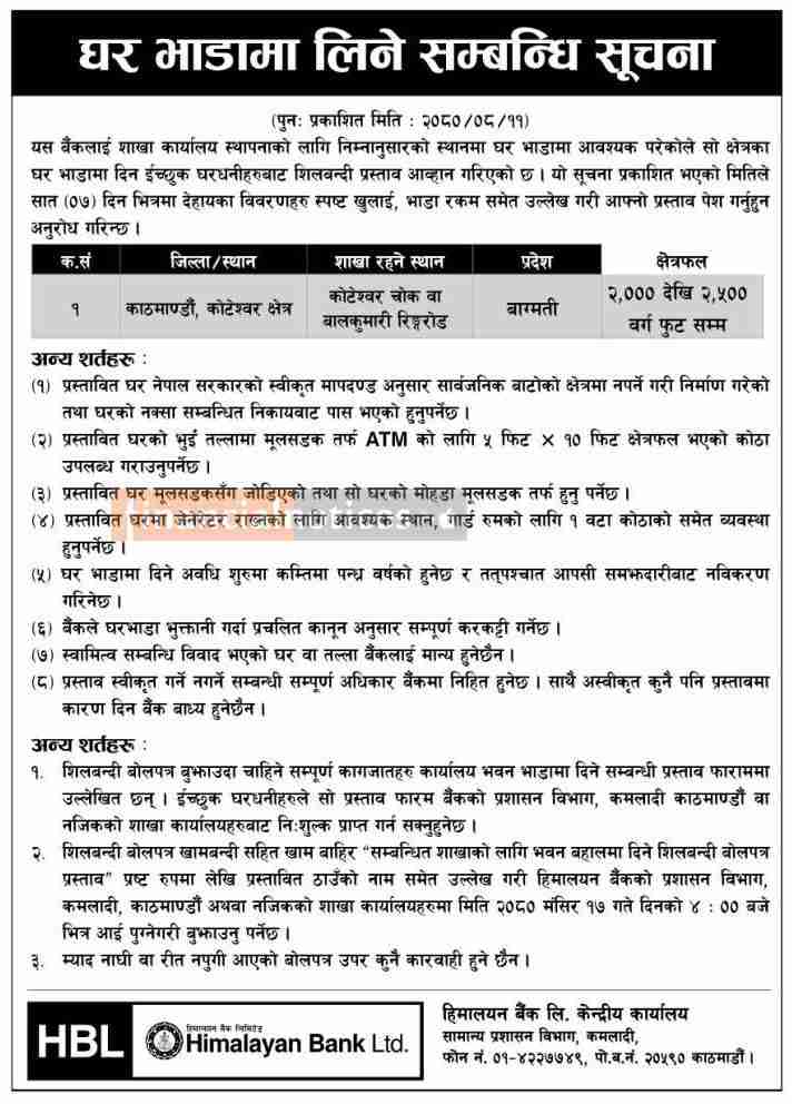 बैंकको शाखा संचालनका लागि घर भाडामा लिने सम्बन्धी सूचना -