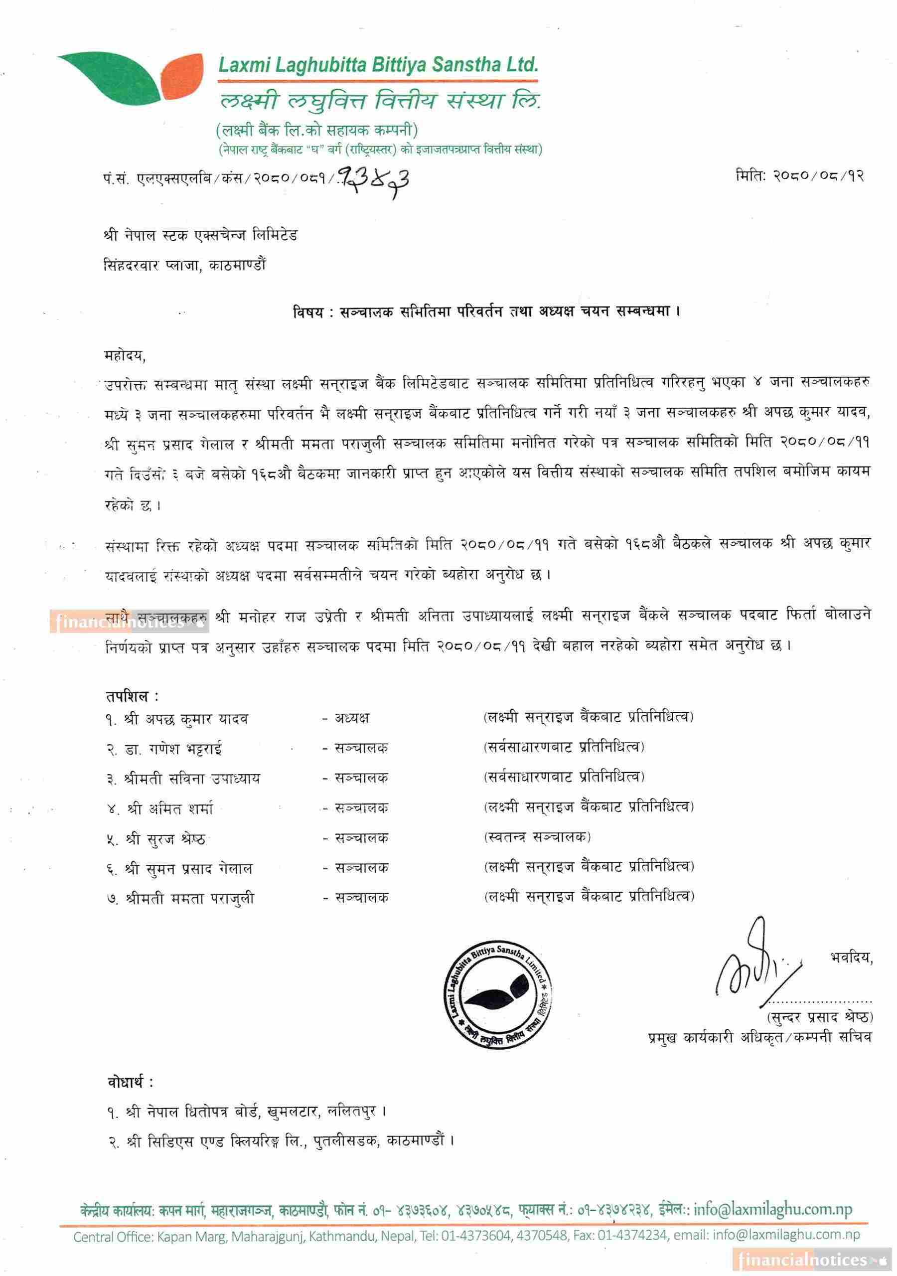 संचालक समितिमा परिवर्तन तथा अध्यक्ष चयन सम्बन्धी सूचना