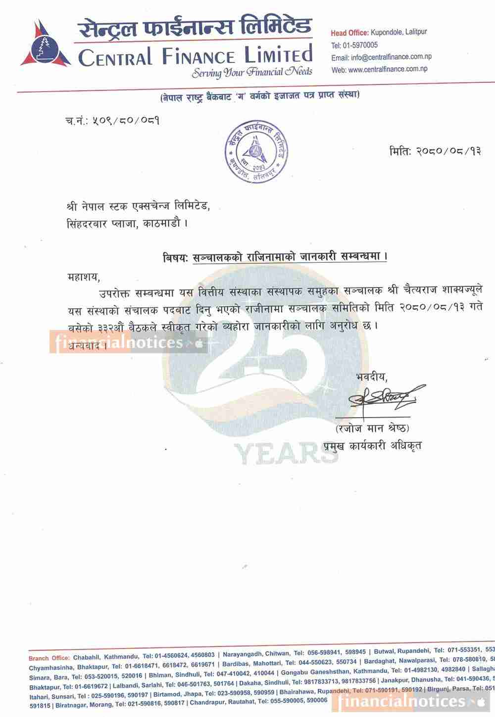 सेन्ट्रल फाइनान्सको सञ्चालकको राजिनामा सम्बन्धी सूचना