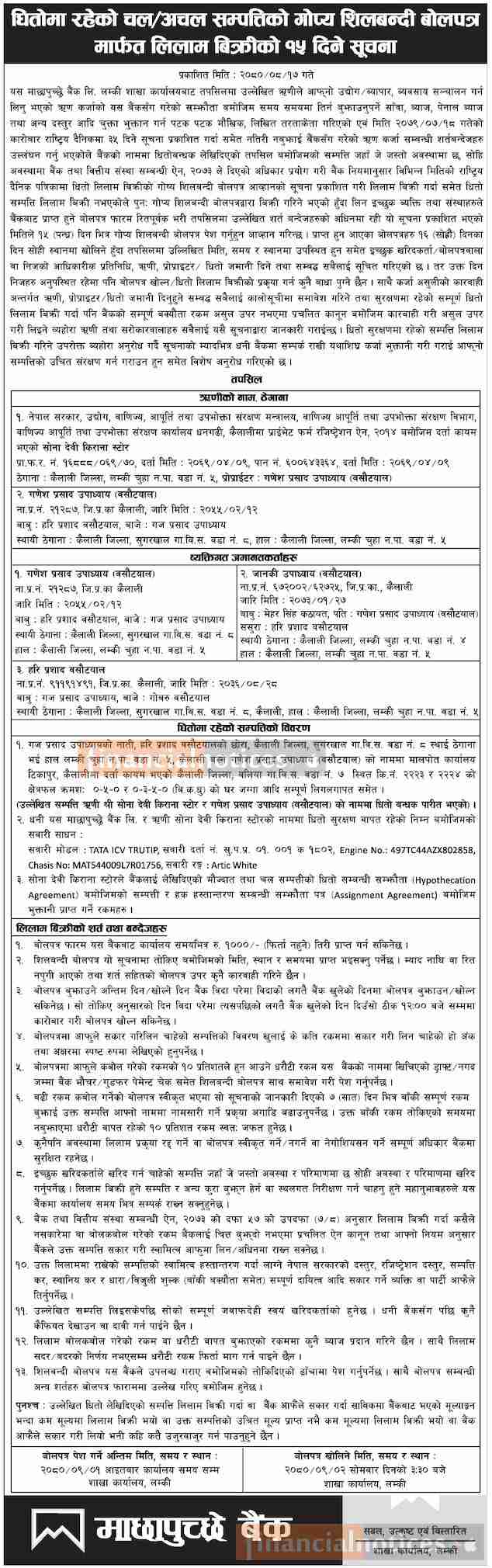 Kumari Bank Auction Notice for Non-Banking Assets at Mahendranagar, Kanchanpur -