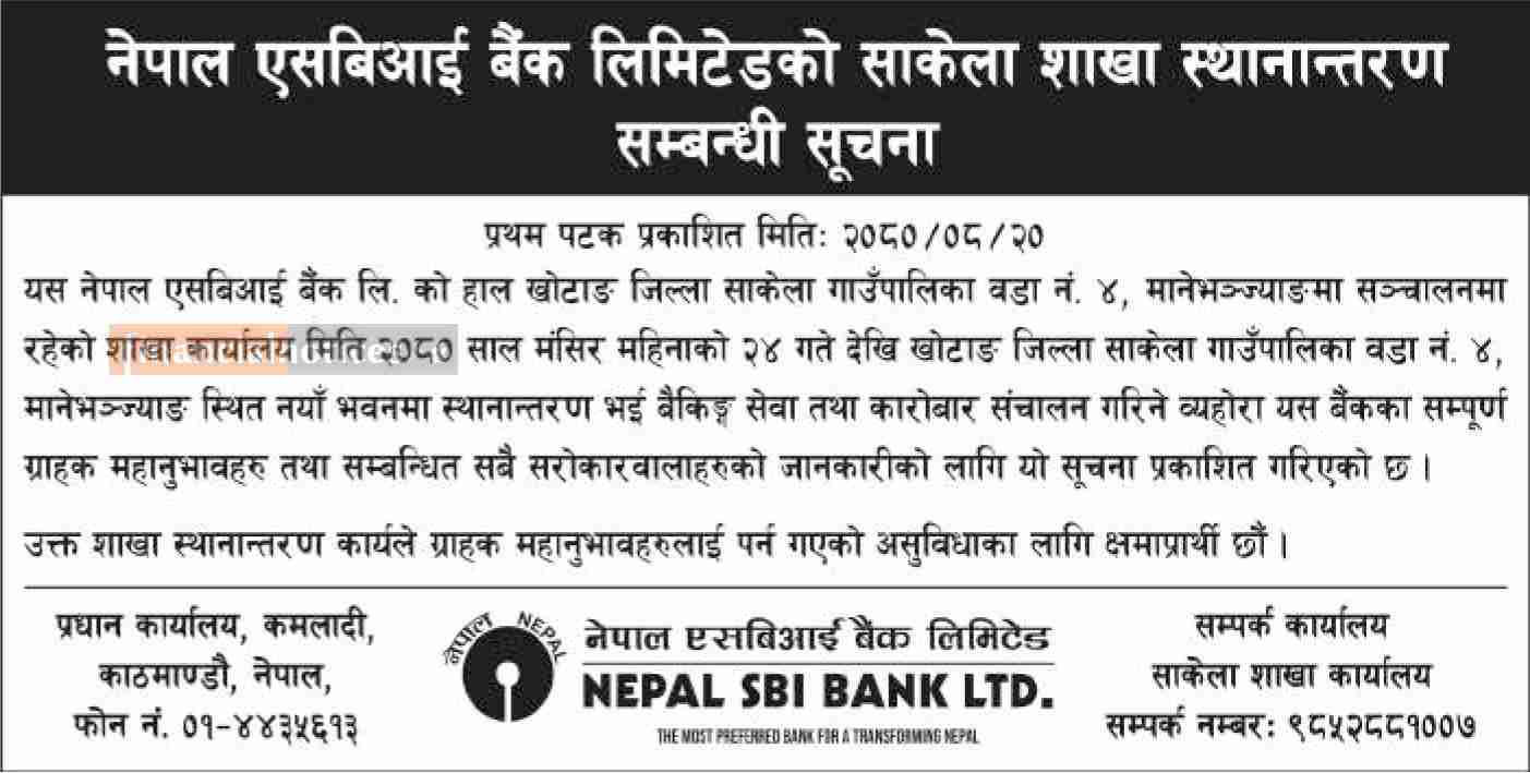 नेपाल एसबिआई बैंकको शाखा स्थानान्तरण सम्बन्धी सूचना