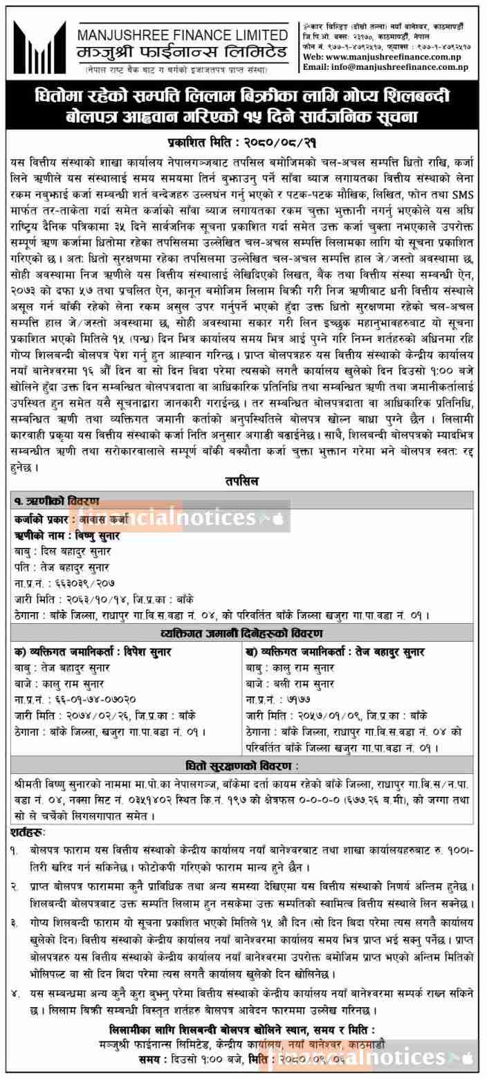 धितोमा रहेको सम्पत्ति लिलाम बिक्रीबारे मञ्जुश्री फाइनान्सको १५ दिने सूचना -