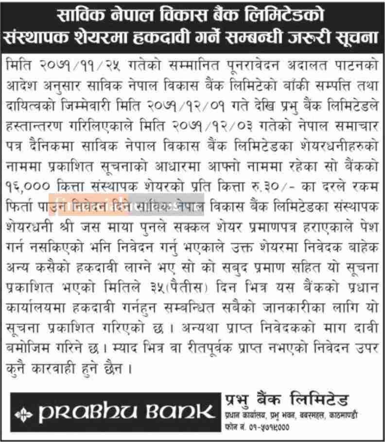 साविक नेपाल विकास बैंकको संस्थापक शेयरमा हकदावी गर्ने सम्बन्धी सूचना