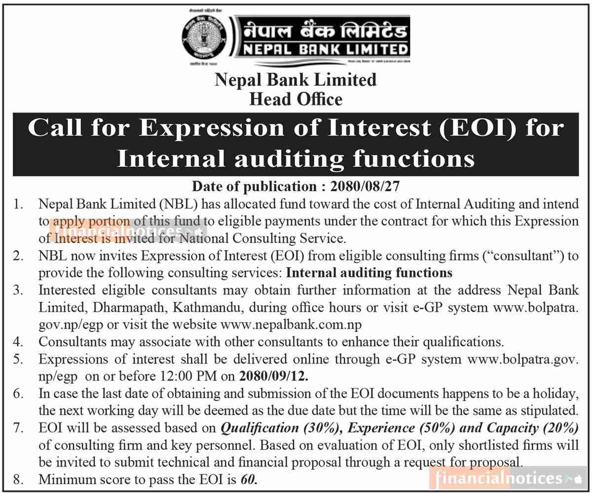 Call for Expression of Interest (EOI) for Internal Auditing Function