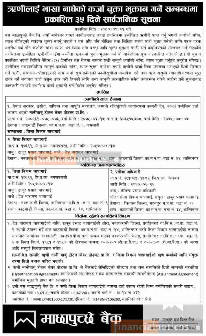 ऋणीलाई भाखा नाघेको कर्जा चुक्ता भुक्तान गर्ने सम्बन्धमा माछापुच्छ्रे बैंकको ३५ दिने सूचना
